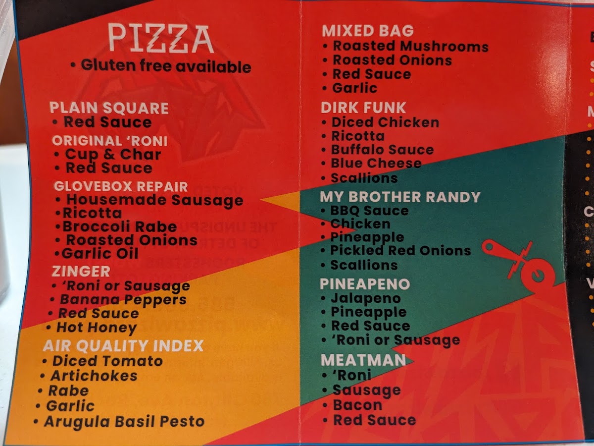 This pizza never leaves the menu yet the name changes every few months. For meatheads, specifically, drivers of large lifted Dodge Rams with sweet offset wheels. Red Sauce, 'Roni, Sausage, Cheese, Bacon. Please stop tailgating!